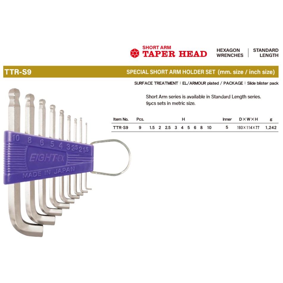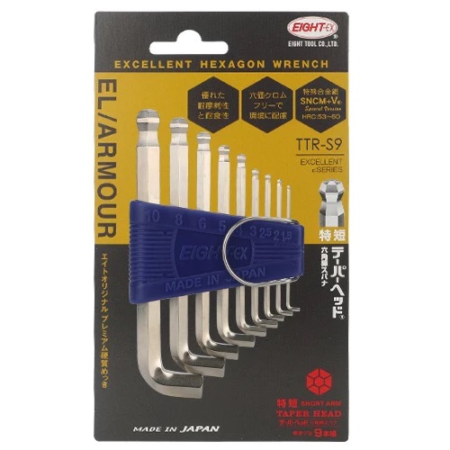 EIGHT TTR-S9 Short Arm Taper Head Hex Key Wrench 9pc Set