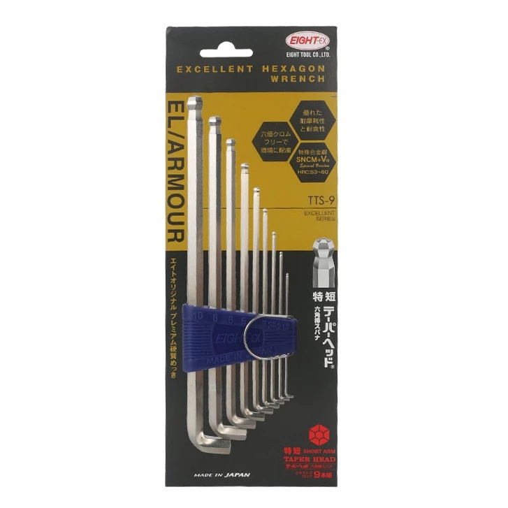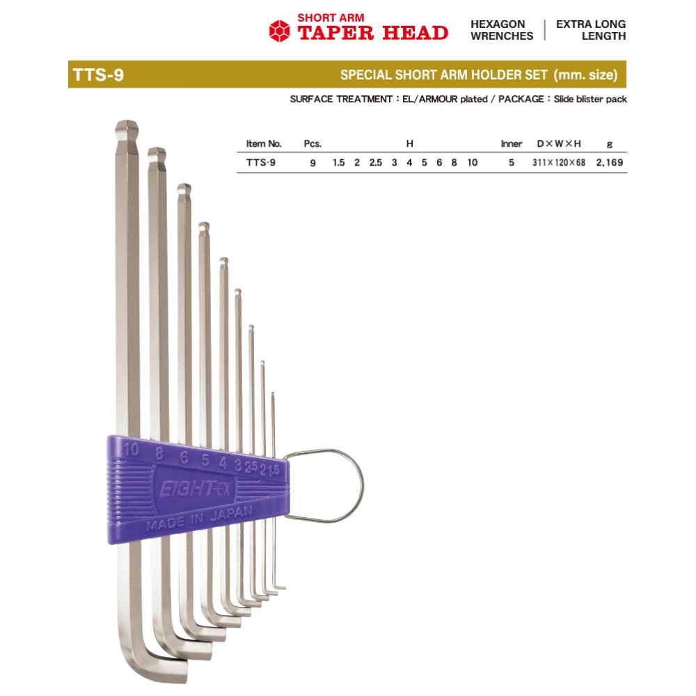 EIGHT TTS-9 Short Arm Taper Head Hex Key Wrench 9pc Set
