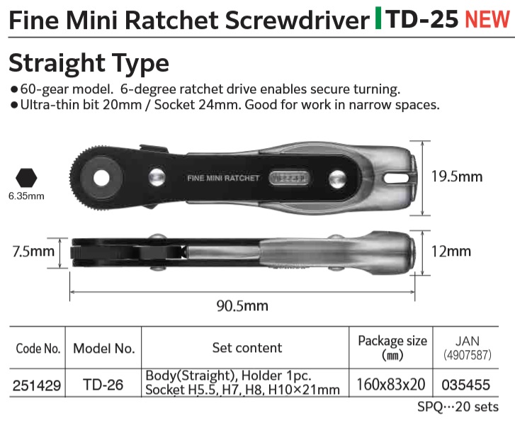 *60-gear model. 6-degree ratchet drive enables secure turning. *Ultimately thin bit 20mm / Socket 24mm. Good for work in narrow spaces.High durability and outstanding strength