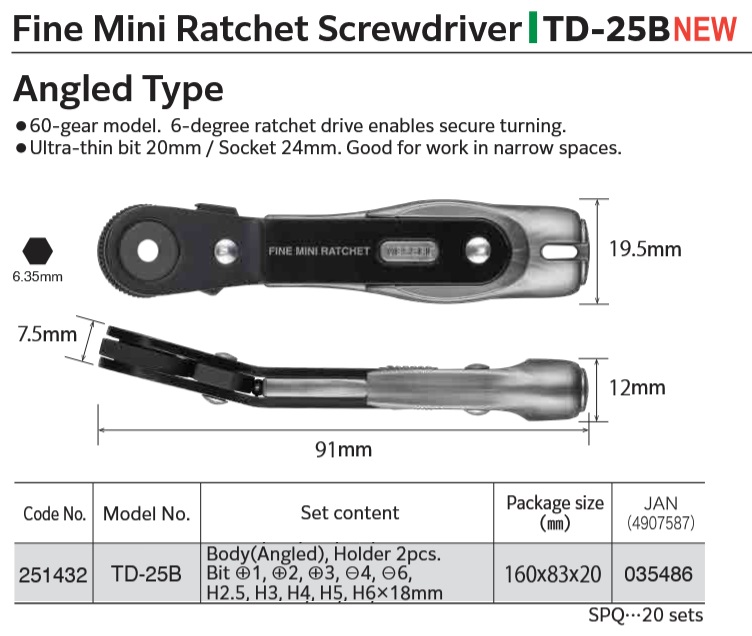 *60-gear model. 6-degree ratchet drive enables secure turning. *Ultimately thin bit 20mm / Socket 24mm. Good for work in narrow spaces.
