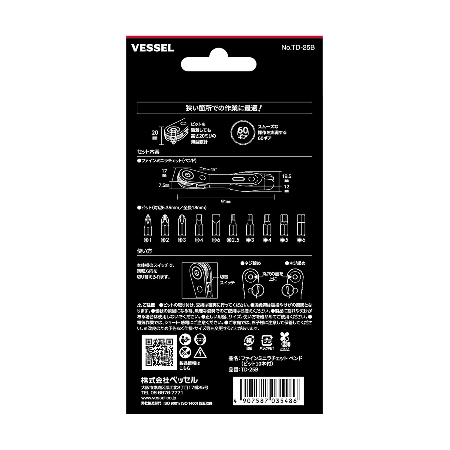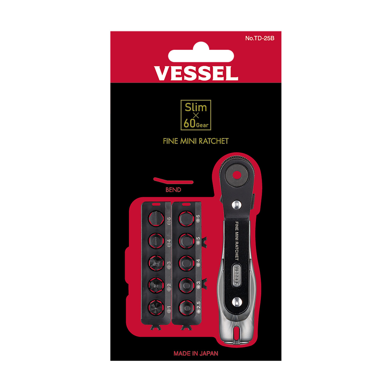VESSEL No.TD-25B Fine Mini Ratchet Screwdriver Angled Type (w/ 10 bits)