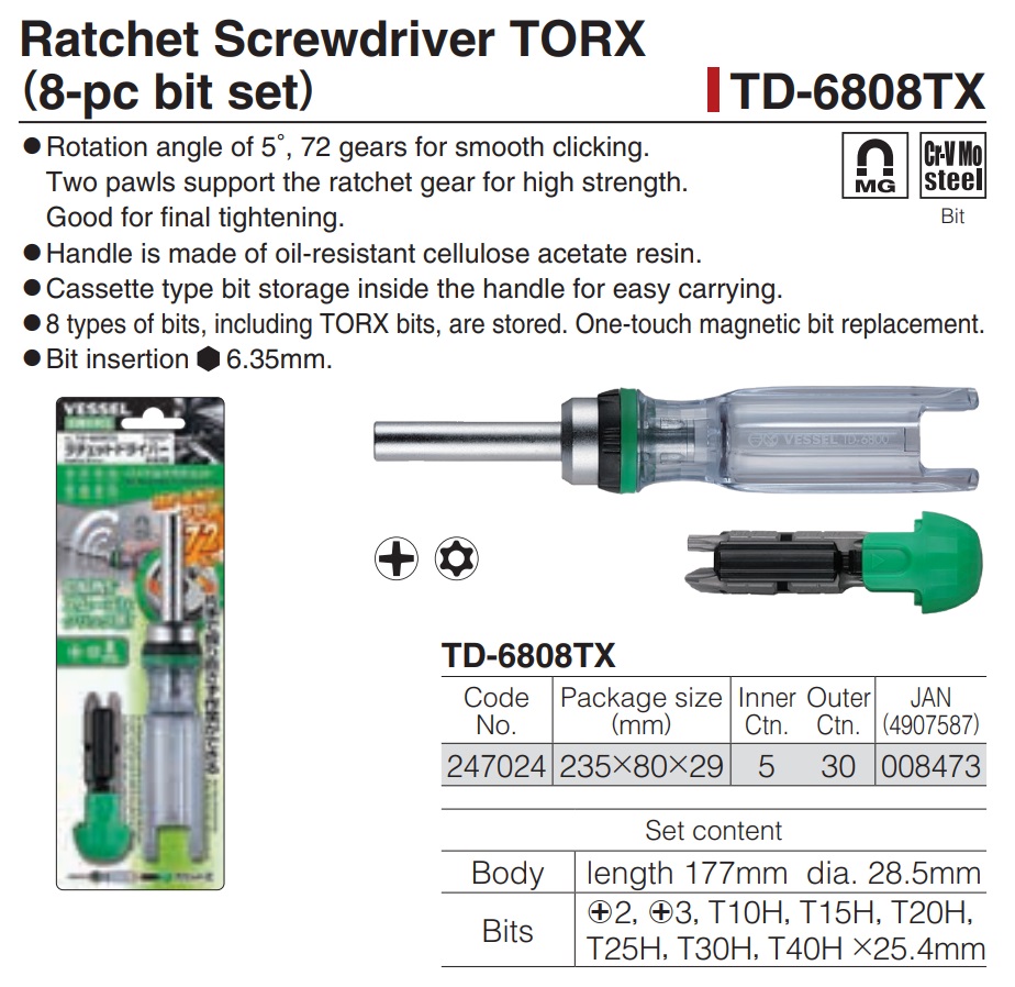 VESSEL No.TD-6808TX Ratchet Screwdriver (w/8 bits)