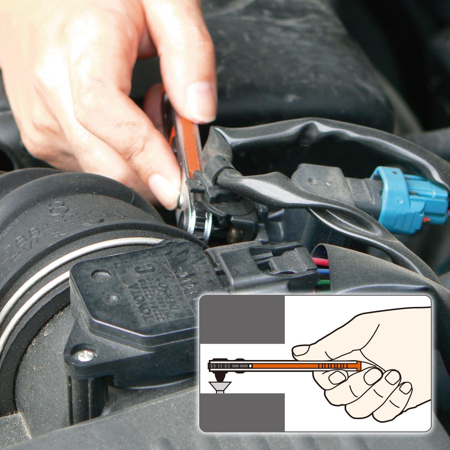 *18mm thin head ratchet. *Magnetized bits convenient for work even in cramped spaces. *2 bits can be stored in the body. With a hanging hole. *High-precision ratchet gear for firm tightening.