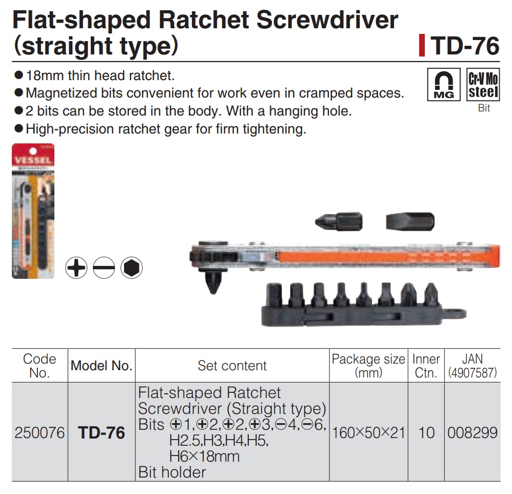 VESSEL No.TD-76 Flat-shaped Ratchet Screwdriver (w/ 11 bits)